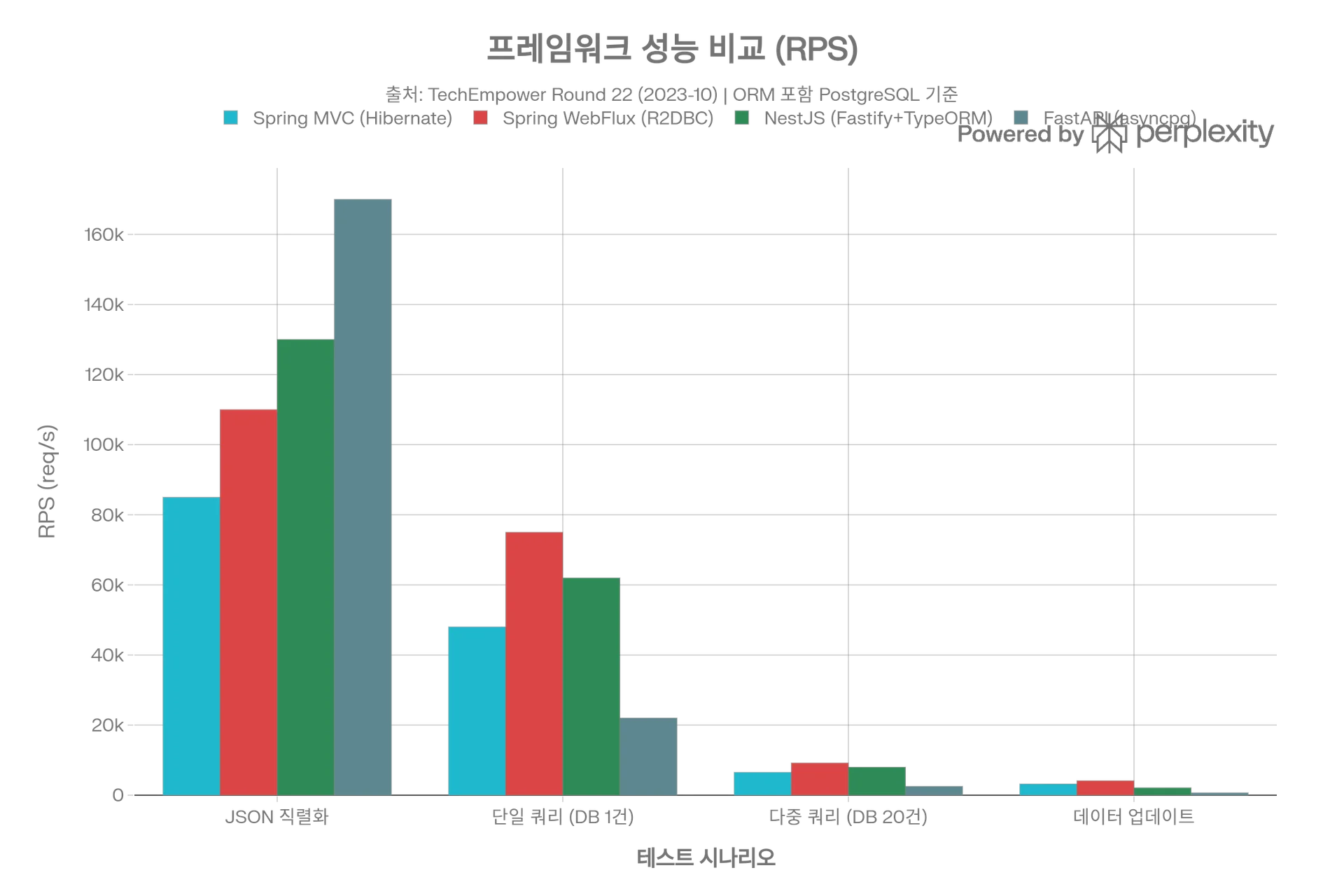 이게 생태계 성숙도를 무시할 수 없는 이유가 있다. 이전 섹션에서 FastAPI와 다른 프레임워크(Spring Boot, Nestjs)와의 비교에서 단순 작업의 처리량은 제일 빠르지만 DB쿼리의 경우는 낮아지는 모습을 확인했다. 그 이유는 아래 생태계의 성숙도 때문이라고 볼 수 있다.