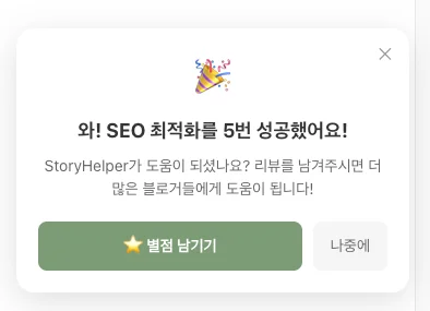 그래서 첫 번째 리뷰 장려 기능은 SEO 검증이 5번 성공했을 시점에 팝업 형식으로 띄워주는 것으로 결정했다.