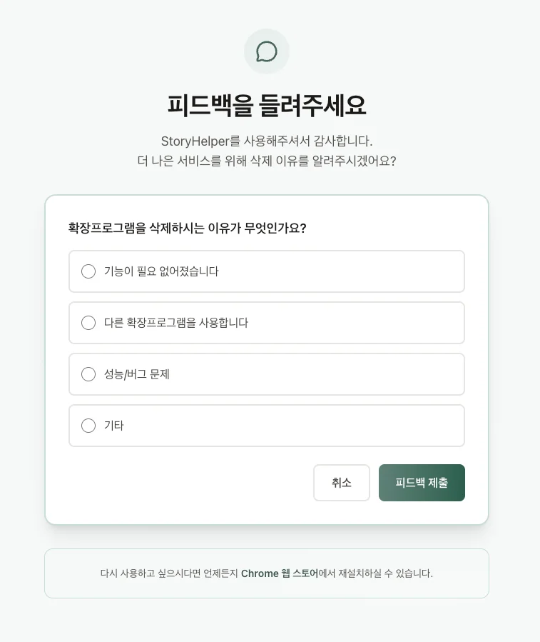 chrome.runtime.setUninstallURL('https://storyhelper.shipfriend.dev/feedback') 이 한 줄만 추가해서 확장프로그램을 삭제할 때 특정 URL로 이동시키는 동작을 추가할 수 있었다.