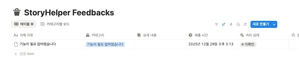 이렇게 수집된 피드백 데이터는 노션 데이터베이스에 저장하도록 했다. 유저 수가 천 단위가 아니기 때문에 DB를 쓰는 건 오버엔지니어링이었기 때문에 이렇게 결정했는데 실시간으로 데이터가 쌓이는게 보이니까 재미있다.