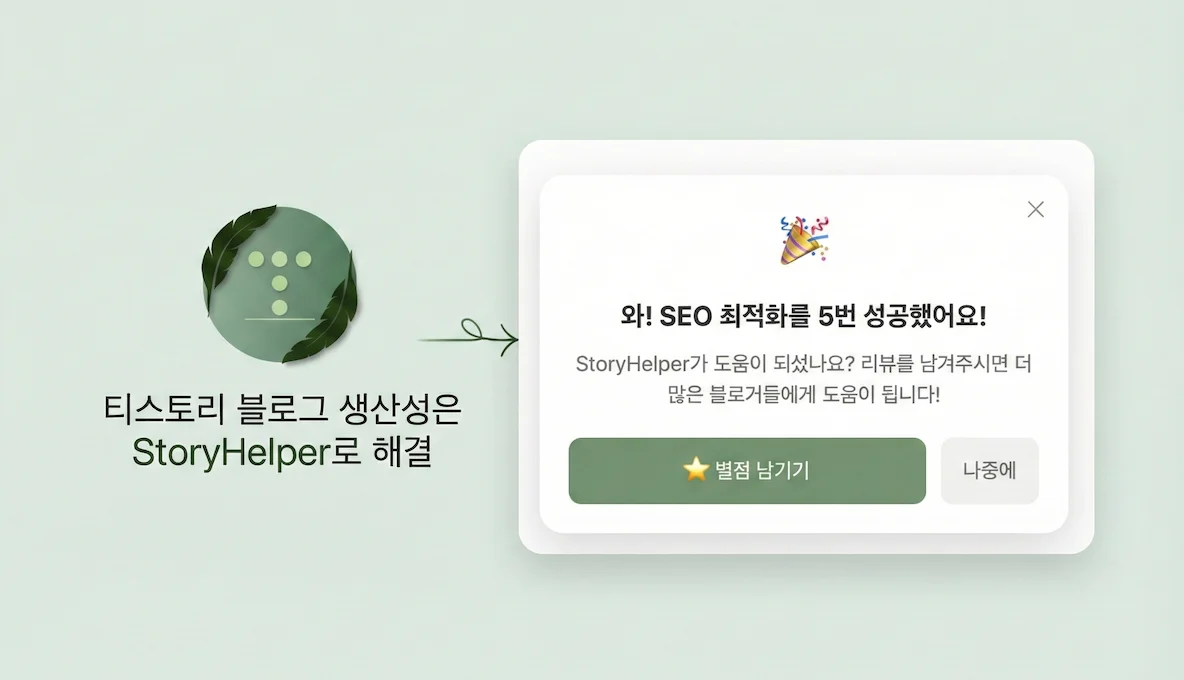 구현은 간단하게 이루어졌다. Extension Storage에 seo 검증 횟수와 리뷰 여부, 나중에 버튼 눌렀을 때 7일 이후 다시 뜨게 하기 위한 timestamp 이렇게 3가지 데이터를 저장했다. 사용자가 처음으로 SEO 검증 5번을 마치면 그때 팝업 창으로 오른쪽 아래에 띄워주는 방식이다.